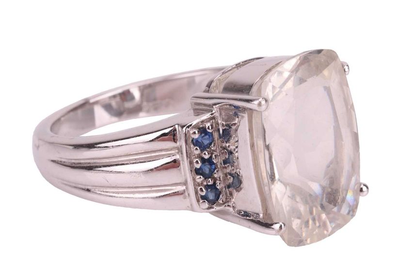 A goshenite (white beryl) dress ring in 9ct gold, the rectangular cushion-cut goshenite measures 14.1 x 10.0 x 7.0 mm, claw-set to a tapering shank, size N½, 6.8 grams.