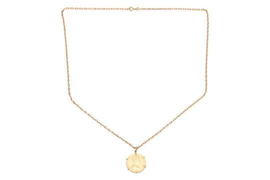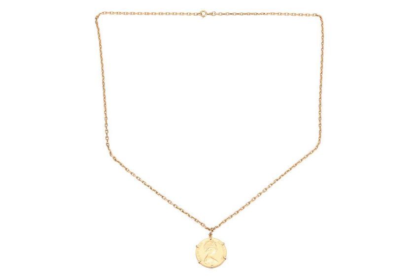 An Isle of Man Elizabeth II 1981 Royal Wedding sovereign on chain, second head, claw-set to a mount in yellow metal stamped ‘18ct’, on a 60.0 cm long cable link chain in yellow metal testing as 18ct; 22.9 grams.
