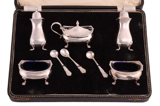 A cased silver cruet set, by William Suckling Ltd., Birmingham 1960, comprising a pair of silver salts, a pair of pepperettes, a mustard pot, and three spoons, all decorated with gadroon border and on four paw feet, total weighable 387.5 grams (12.45ozt), in fitted Harrods case.