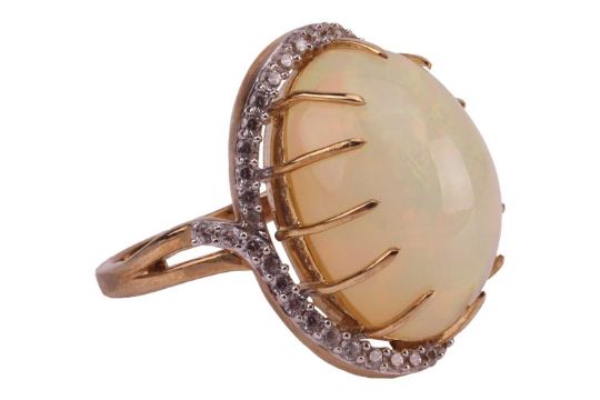 An Ethiopian opal halo ring in 9ct gold, consisting of a large Ethiopian opal cabochon of 18.1 x 13.1 x 8.6 mm, in a surround set with CZ accents, British assay marks, size L½, 6.3 grams.