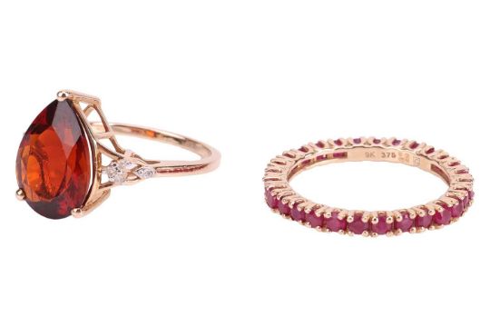Two gem-set rings, comprising a pear-cut andesine-set ring, flanked by round brilliant diamonds, to a 9ct yellow gold mount, size N1/2, together with a ruby-set eternity ring, in a 9ct yellow gold mount, size Q; 5.3 grams (2)