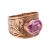 A synthetic pink sapphire dress ring, the tapering wide band collet-set with an oval-cut synthetic pink sapphire, measuring 9.3 x 7.5 mm, decorated with foliate engravings, in yellow metal stamped ‘583’, size L½, 4.2 grams.