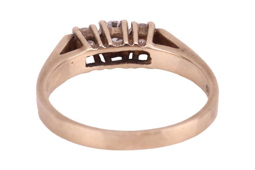 A diamond set pendant necklace and a CZ trilogy ring; the pendant set with a round brilliant cut diamond of 3.2mm, to an abstract design in polished yellow metal, testing as 9ct, drop approximately 2cm, suspended from a fine curb chain of yellow metal terminating in a spring-ring clasp stamped "9k", length 45.0cm; together with a trilogy ring set with three CZs, in raised prong settings, to a polished flat band in yellow metal stamped "9k", size L; combined weight 5.0 grams.