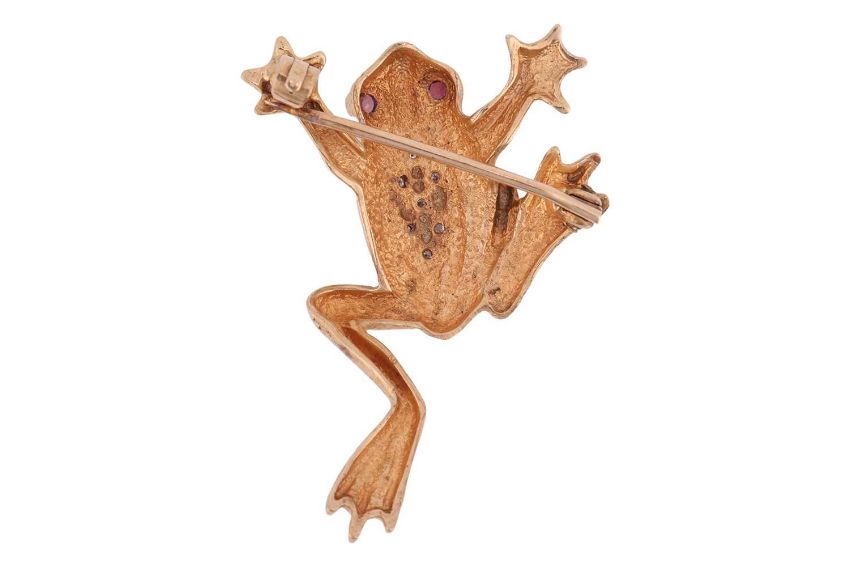 A gem-set frog brooch in 9ct gold, the body embellished with single-cut diamonds and eyes set with ruby accents, brooch fittings to reverse, British assay marks, 3.5 x 2.5 cm, 3.6 grams.