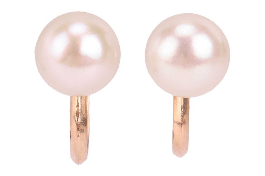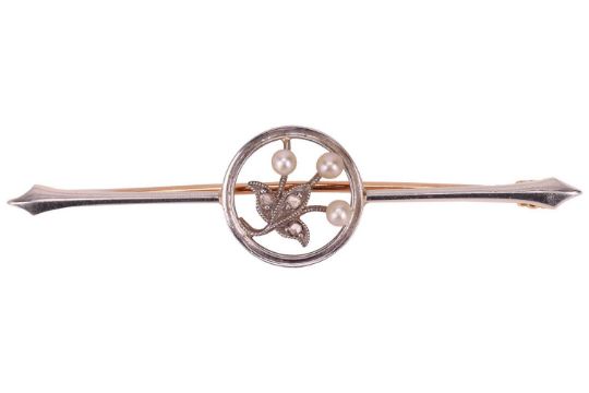 A seed pearl and diamond-set bar brooch, of foliate design, to pin and C clasp fitting, the reverse marked '15ct' and 'Plat'; with two pairs of cultured pearl earrings, both with screw backs marked '9ct' and '14K'; Total weight 7.5 grams