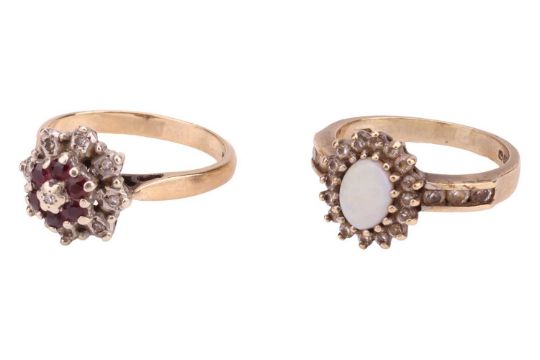 Two gem-set rings; The first a ruby and diamond cluster ring, the diamonds in illusion settings, to a 9ct gold ring shank, ring size L 1/2; The second an opal and cubic zirconia cluster ring, to a 9ct gold ring shank, ring size K; Total weight 5.7 grams.