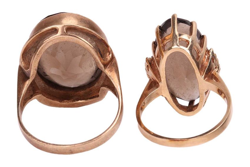An oval smoky quartz ring in 9ct gold, bevelled surround to flat shank, size P; together with another similar in yellow metal stamped '10K GTR', size L; total weight of items 12.4 grams. (2)