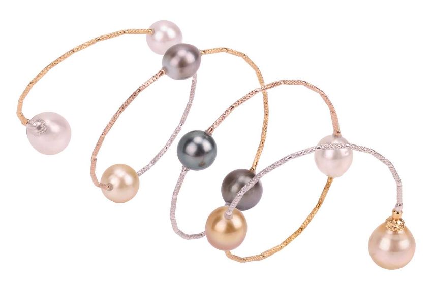 A cultured pearl and wire bracelet, of wraparound design, composed of cultured pearls, of varying colours, interspersed by textured wire connectors, of tri-colour metal surface tested as 18ct; 19.0 grams