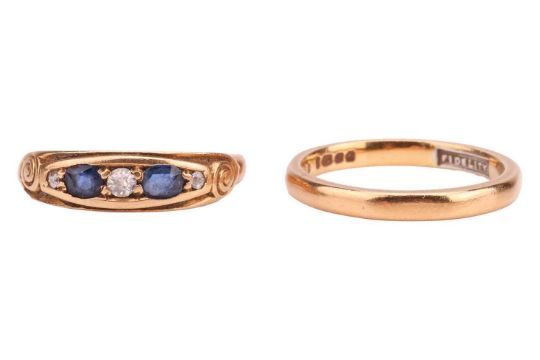A sapphire and diamond ring and a 22ct gold wedding band, 1st) each oval-shaped sapphire flanked by single-cut diamonds, approximately 0.05ct total, to scroll detail, mounted in 18ct yellow gold, stamped with maker's mark CG, Birmingham hallmark, split shank, ring size I 1/2, 2nd) the 22ct yellow gold band, stamped with Birmingham hallmark and maker's mark possibly HG&C, ring size J, gross weight 4.9 grams (2)