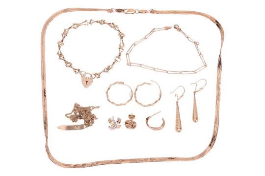 A group lot of jewellery, to include a 9ct gold herringbone chain, 51.0cm; A 9ct gold fancy-link bracelet with heart padlock clasp; And others surface testing as 9ct, 14ct and base metal, including earrings and chains. Total weight 16.8 grams