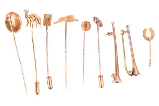 A collection of stick pins and brooches; to include a banded agate cabochon agate in yellow metal testing as 14ct, a camel motif stick pin testing 9ct, an Etruscan Revival horseshoe stickpin marked '15ct', a leaping hare stickpin marked '9ct', another Etruscan Revival split pearl pin marked '15ct', a square-cut sapphire and split pearl pin testing 18ct, an 9ct gold Cropp & Farr hunting horn bar brooch with fittings deficient, another hunting horn brooch marked '18ct', and a broken horseshoe pin with split pearls; including the stoppers total weight of items 19.7 grams. (9)