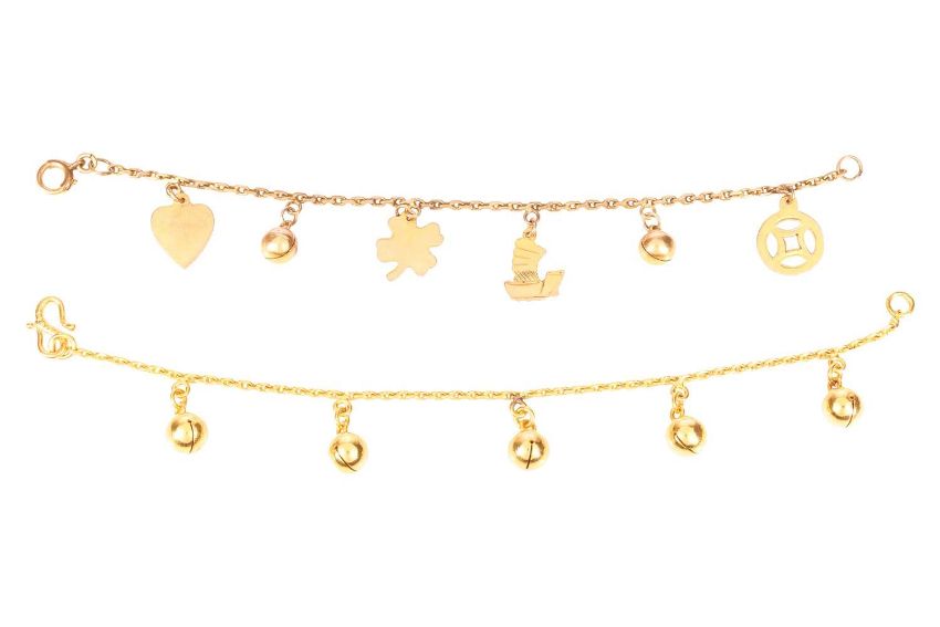 Two children's charm bracelets; the first contains a series of cable links suspending five bells, to an S-hook clasp, yellow metal testing as 18ct, 14.5 cm long, 7.7 grams; another similar suspending bells, and various charms such as a junk ship, a Chinese coin, a heart and a clover leaf, spring-ring clasp closure, chain testing as 9ct, some charms are marked '14K', 13.0 cm long, 3.7 grams. (2)