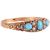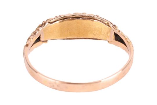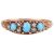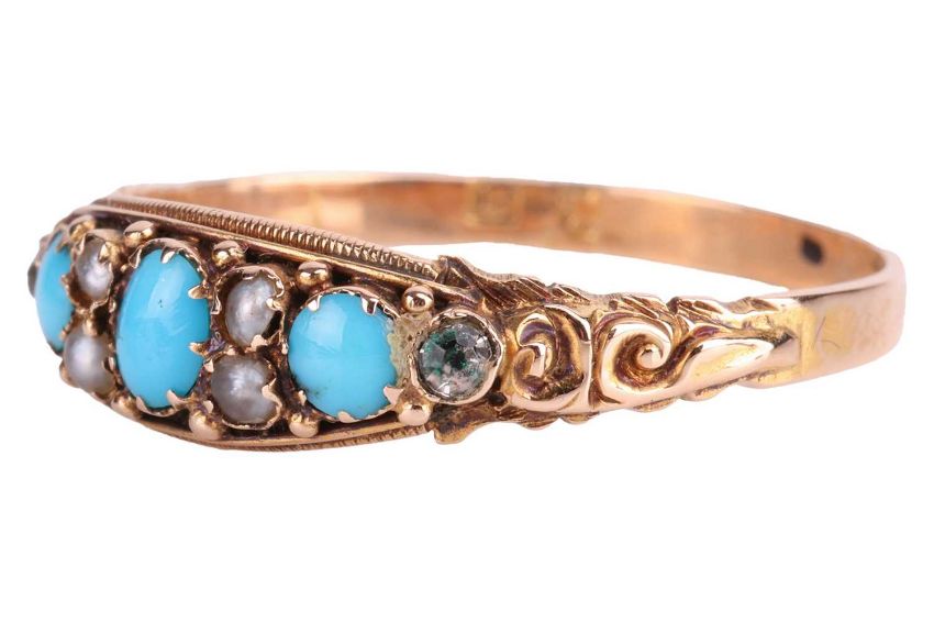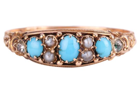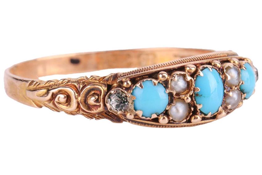 A Victorian turquoise and split pearl half hoop ring, set with three graduated turquoise oval cabochons, interspersed with seed pearls and paste, between scrolled shoulders, shank struck with Birmingham assay marks for 15ct gold, 1881, size R, 1.7 grams.