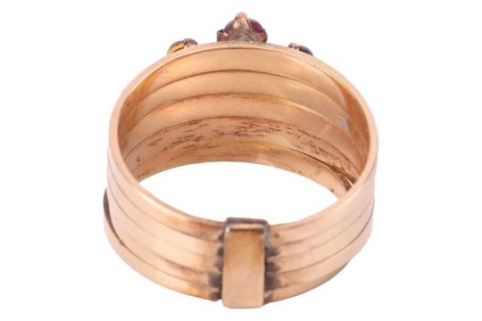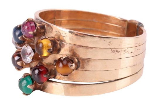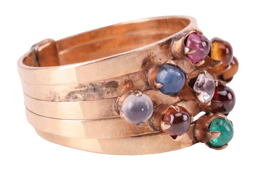 A Thai nine gem 'Noppakao' Harem ring, comprising five rings adjoined at the base, claw-set with round cabochons of moonstone, corundums, emerald etc., representing the planets in the solar system, unmarked yellow metal testing as 14ct, size Q, 5.6 grams.