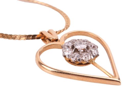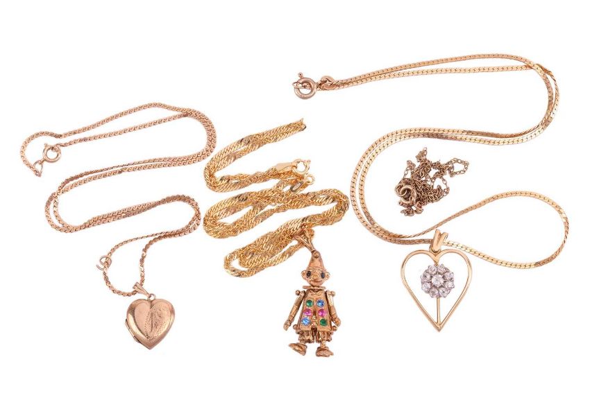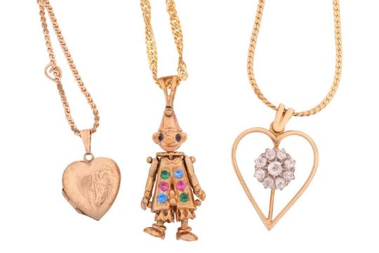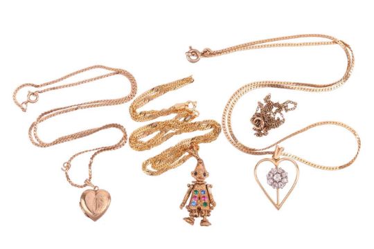 Several necklaces comprising a heart and flower pendant, set with old-cut diamonds, on a 9ct gold chain; a 9ct gold heart locket and chain; a 9ct gold gem-set clown pendant and fancy-link chain; and a yellow metal chain marked '9K'; 17.2 grams (4)