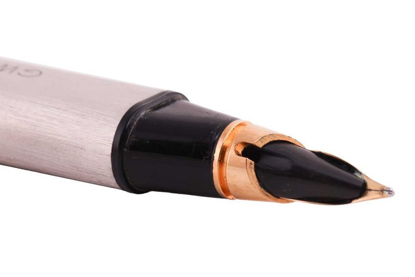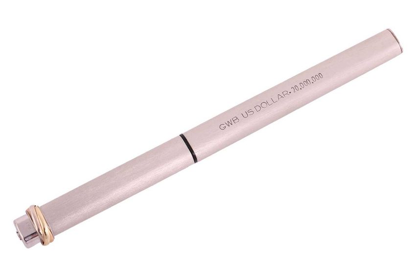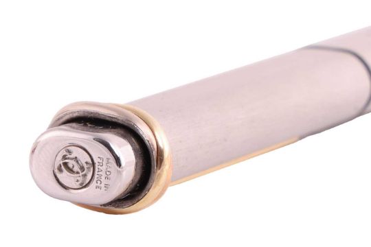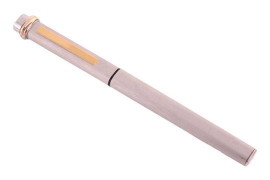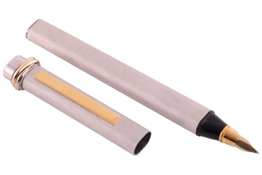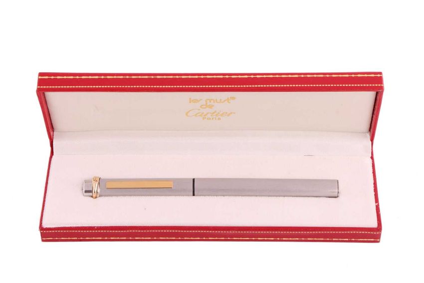 Cartier - a Must de Cartier Vendome fountain pen of tri-coloured design, the main casing of brushed stainless steel, highlighted by a polished 18ct yellow gold plaque and a tri-gold trinity highlight to the cap, numbered 59928, stamped with double C logo, signed Cartier Paris, engraved GWB US DOLLAR 20.000.000, together with fitted case and outer box, gross weight 22.9grs