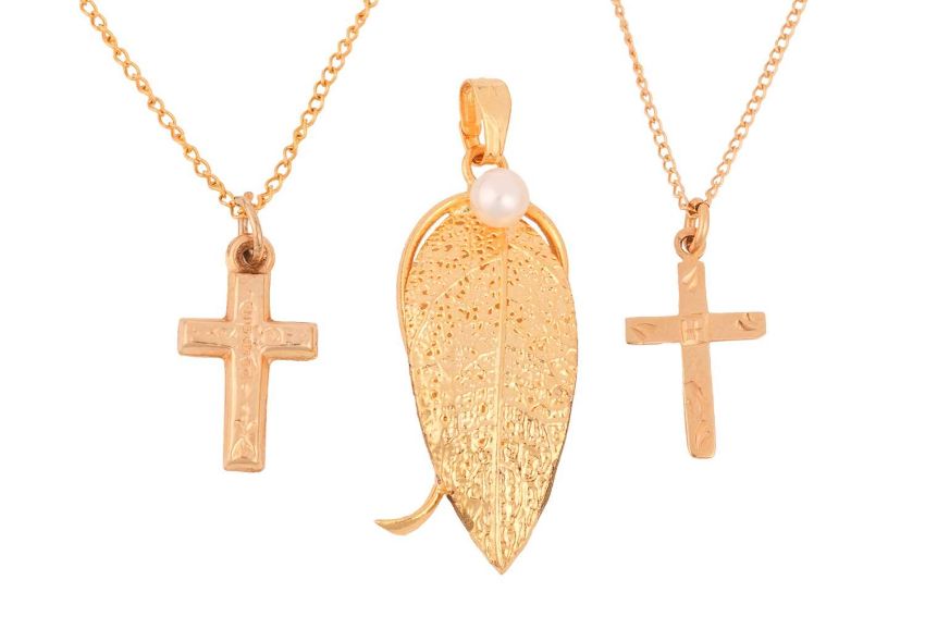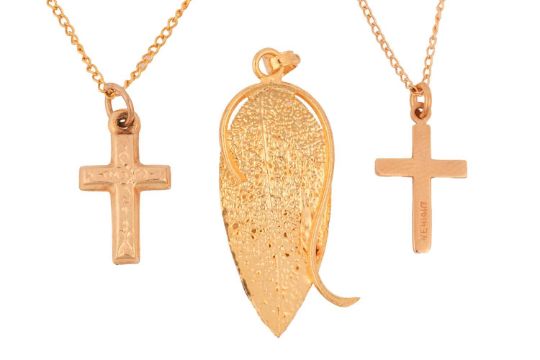 A collection of jewellery items comprising a 9ct gold cross pendant, to a trace chain tested as 14ct gold, a cross pendant and chain, both marked '14K', and a pearl-set leaf pendant, tested as base metal; total weighable: 2.4 grams