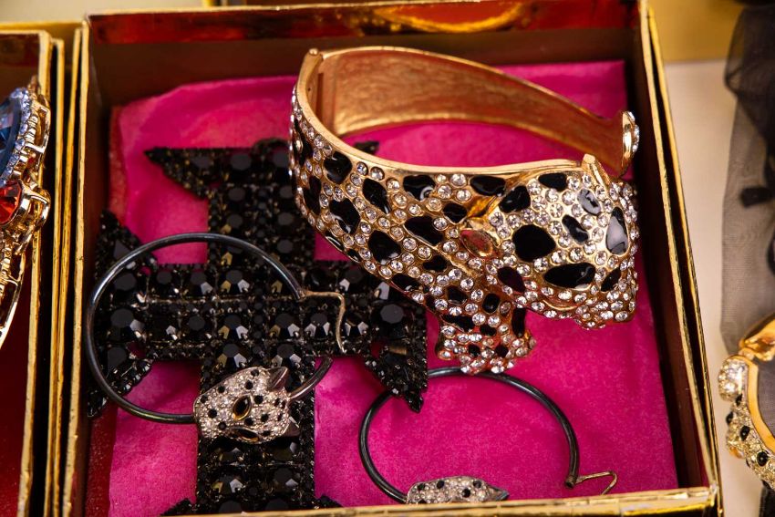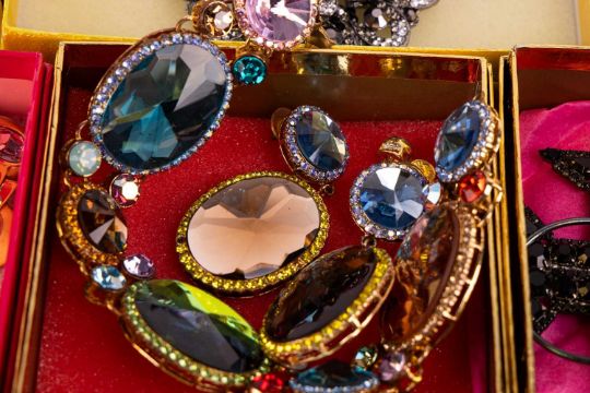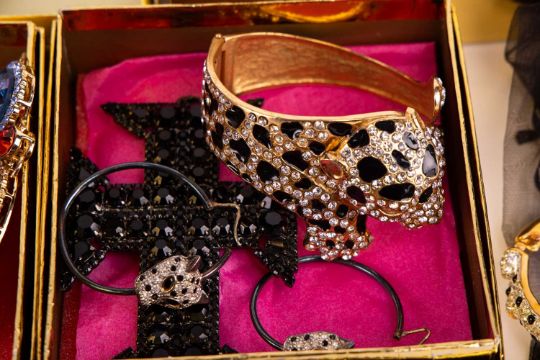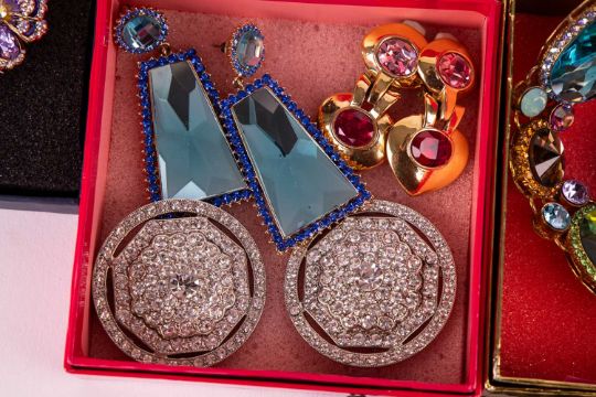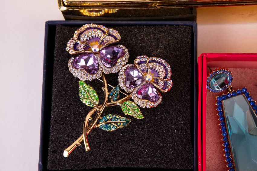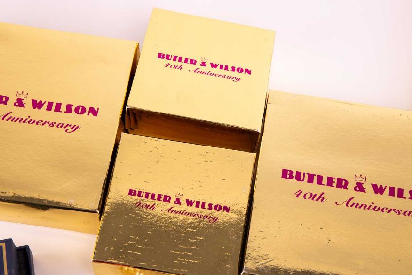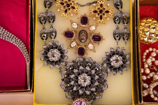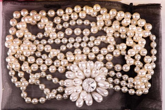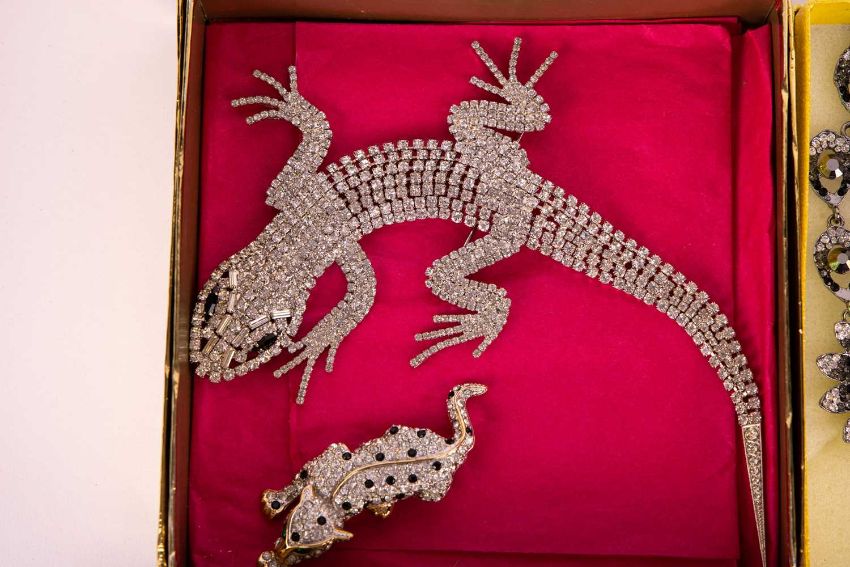 A collection of Butler and Wilson costume jewellery including a gem-set pansy brooch, a large salamander brooch, a pair of circular gem-set ear clips, a pair of Maltese cross ear clips, a black cross pendant, a pair of heart drop earrings, set with imitation pearls, a pair of domed ear clips, of quilted design and a large gem-set brooch together with other costume jewellery including a pair of gem-set ear clips by Ciner, an imitation pearl necklace by Miriam Haskell, a large floral imitation pearl necklace by Sharra Tagano and other items