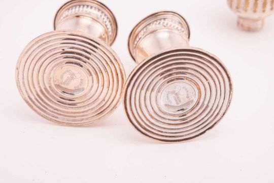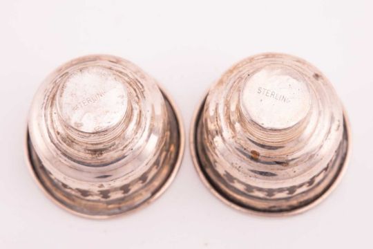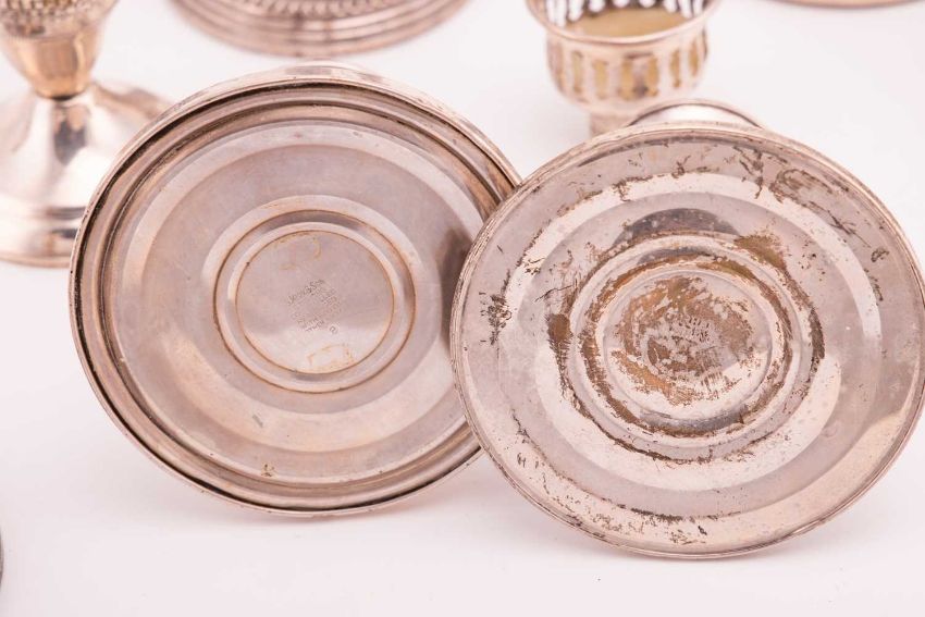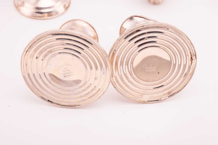 Five pairs of American "Sterling" dwarf candlesticks, each with weighted bases, comprising a pair with gadrooned borders, 11cm high, another decorated with flowers, 10cm high, a pair with pierced candleholders, 8cm high, a plain pair, 9cm high another pair similar with detachable pierced screw in candle sconces, 12cm high, (10).