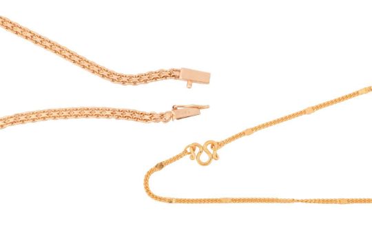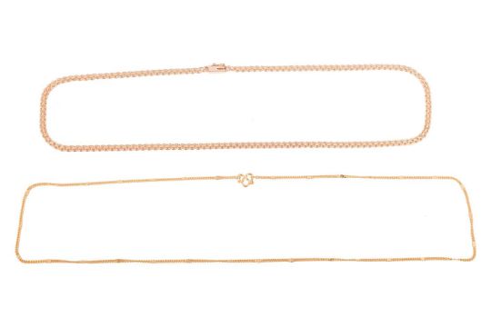 Two chains comprising a fancy link yellow metal chain marked '14K', measuring approximately 40cm, together with a curb link chain with spacers, tested as high-carat gold, measuring approximately 45cm; 11.0 grams (2)