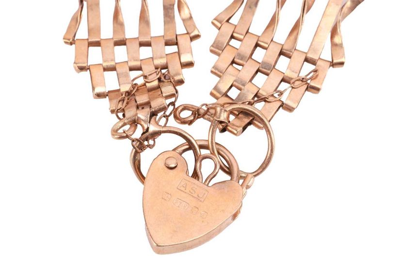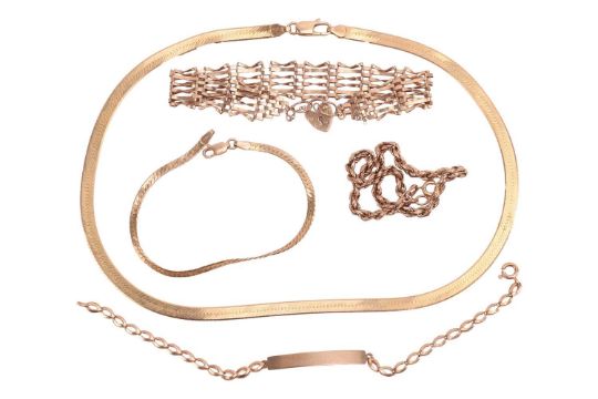 A small collection of jewellery items comprising a 9ct gold gate bracelet with heart padlock, a 9ct gold snake bracelet and matching necklace, a 9ct gold identity bracelet and a 9ct gold twist bracelet; 24.3 grams (5)