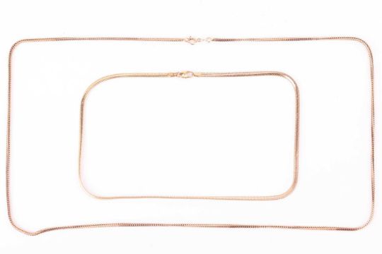Two 9ct yellow gold chains; including a 70.5 cm foxtail chain with spring-ring clasp, and a 42.0 cm long snake chain with lobster clasp, both with British assay marks, total weight of items 24.3 grams. (2)