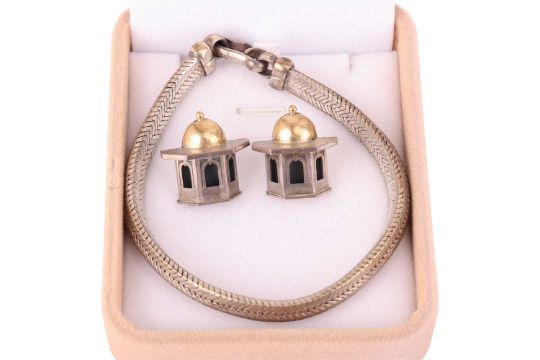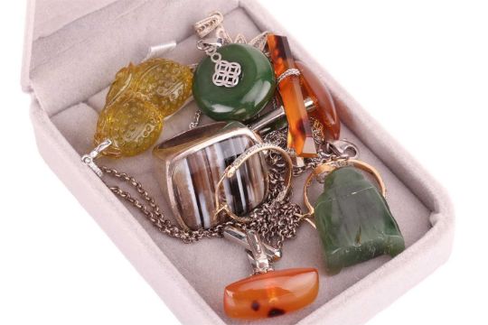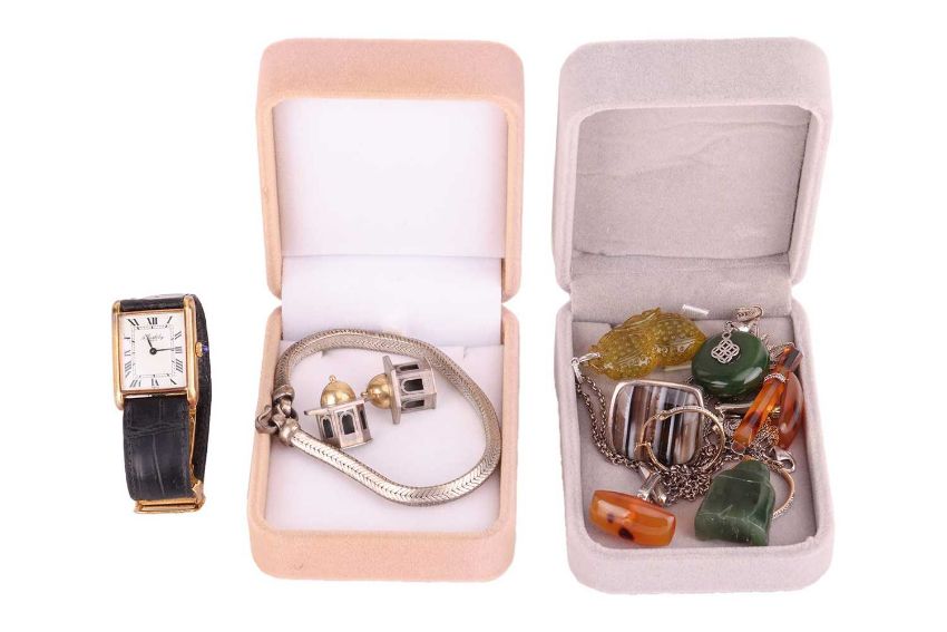 A small collection of jewellery items; including examples of carved nephrite pendants, a pair of Vicki Ambery-Smith architectural earrings in silver, a tortoiseshell tie slide and matching cufflinks, a banded agate cocktail ring, an A. Barthelay watch with must de Cartier strap, a loose oval-cut aquamarine 8.2 x 6.0 x 4.0 mm, three other pear-shaped citrines, and other items.