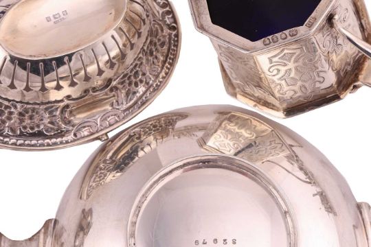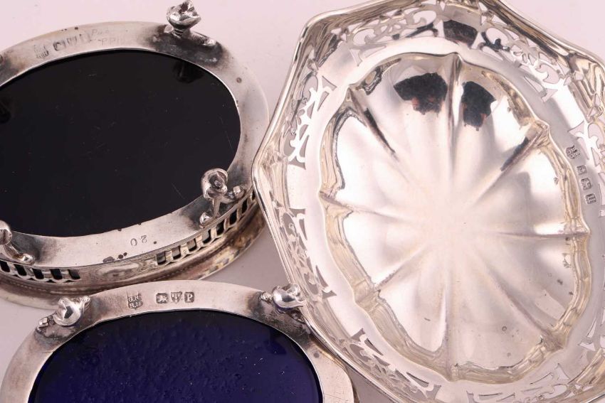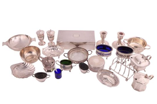A mixed collection of silver and plate to include a Mappin & Webb silver cigarette box, a pair of silver dwarf candlesticks with weighted bases, a silver toast rack, a pair of silver salts with blue glass liners, a pair of silver two-handled salts with half reeded decoration, a silver shell-shaped butter dish, a silver round bowl, two silver two-handled bowls, two silver mustard pots with blue glass liners, and another, a silver salt with green glass liner, a silver bonbon dish, a Victorian cut glass dressing table box with silver pull-off cover, a silver framed two handled butter dish, and a pair of silver plated pepperettes, 43.6ozt weighable.