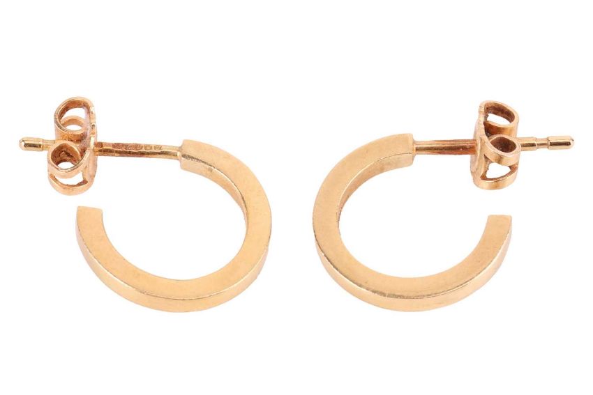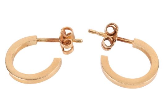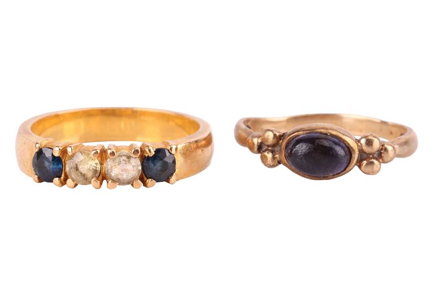 Two gem-set rings and a pair of hoop earrings; to include an iolite dress ring in 9ct gold, oval cabochon collet set between granulated shoulders, size J½; a half hoop ring set with blue and yellowish sapphires, unmarked yellow metal testing as 18ct, size K½; and a pair of hoop earrings with flat edges in 18ct gold, 1.5 cm drop; Total weight of items 10.1 grams. (3)