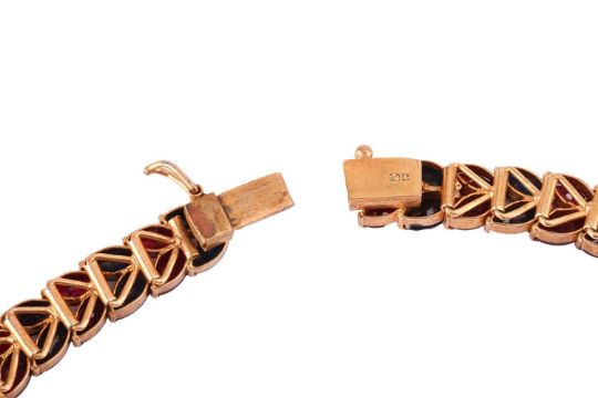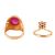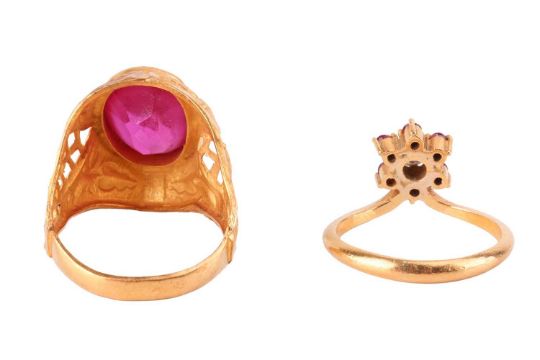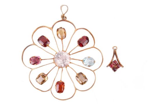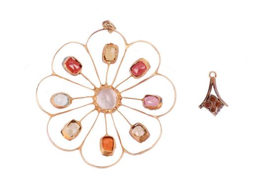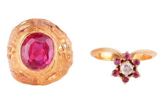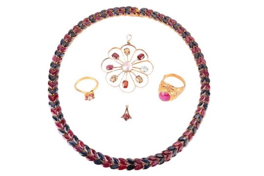 A necklace, two pendants and two rings; a collar necklace set with alternating marquise-cut sapphires and rubies in articulating links, completed with a concealed tongue clasp, gilt metal, 40.0 cm long; a nine-gem pendant set with various faceted gemstones representing the solar system, testing as 18ct; a synthetic ruby dress ring in floral mount, testing as high carat; a chevron ring set with CZ and rubies, knife-edge shank testing as 18ct; and a small pendant set with a cluster of circular-cut rubies; Total weighable 13.9 grams. (5)