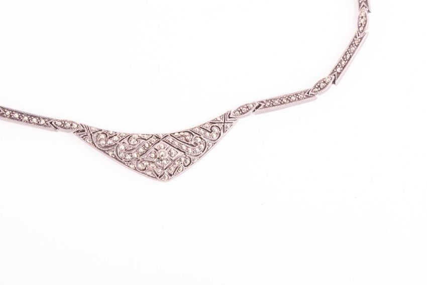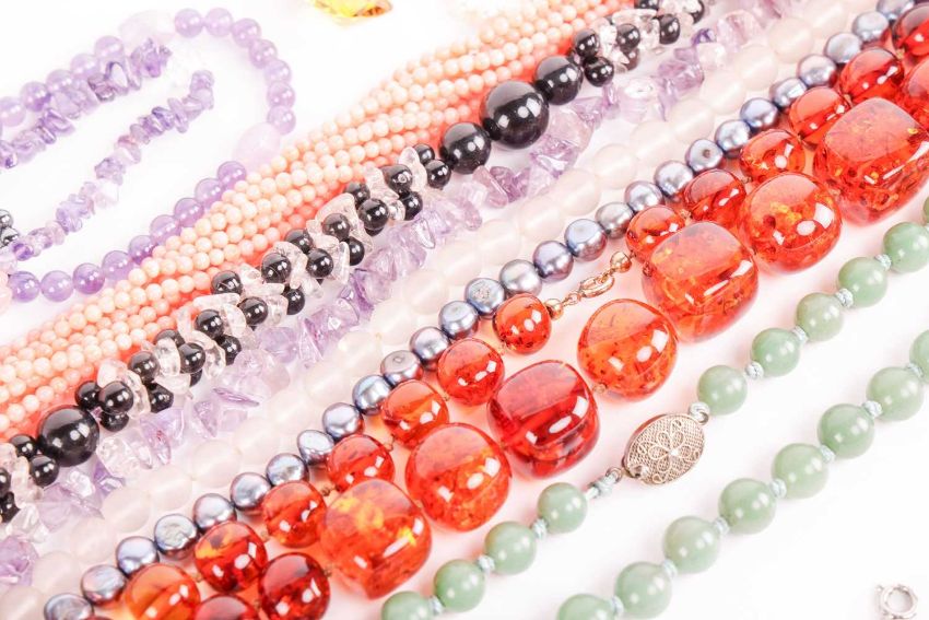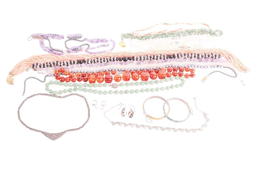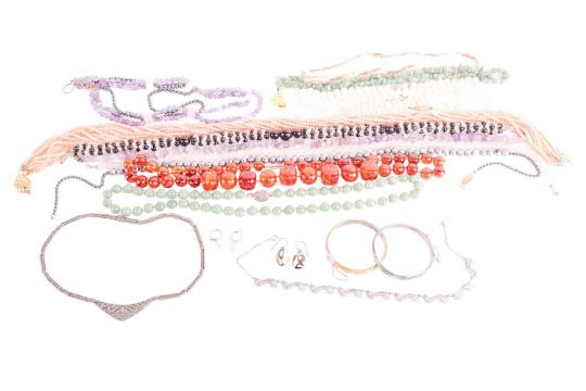 A group lot of jewellery, to include beaded necklaces of amber, coral, quartz, hematite, cultured pearl and aventurine; a synthetic yellow sapphire pendant of pear shape in a foliate surmount, 3.0 cm long; and other marcasite jewellery items.