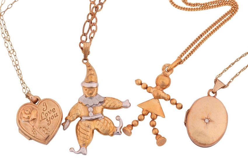 A collection of jewellery items including a 9ct gold and coral bead necklace, a 9ct bi-colour gold clown pendant, a 9ct gold beaded doll pendant, and two other lockets, both marked '375'; 17.6 grams (5)