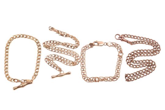 Four chains in 9ct gold; to include a flat curb link necklace with a T-bar pendant, 48.0 cm long; a matching bracelet also with T-bar charm, 20.0 cm long; a fancy link bracelet measuring 19.0 cm long; and a curb link chain with a swivel clasp termination, measures 39.0 cm long; all struck with British hallmarks, total weight of items 40.1 grams. (4)
