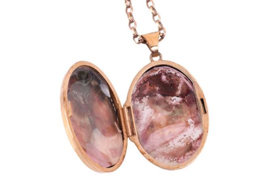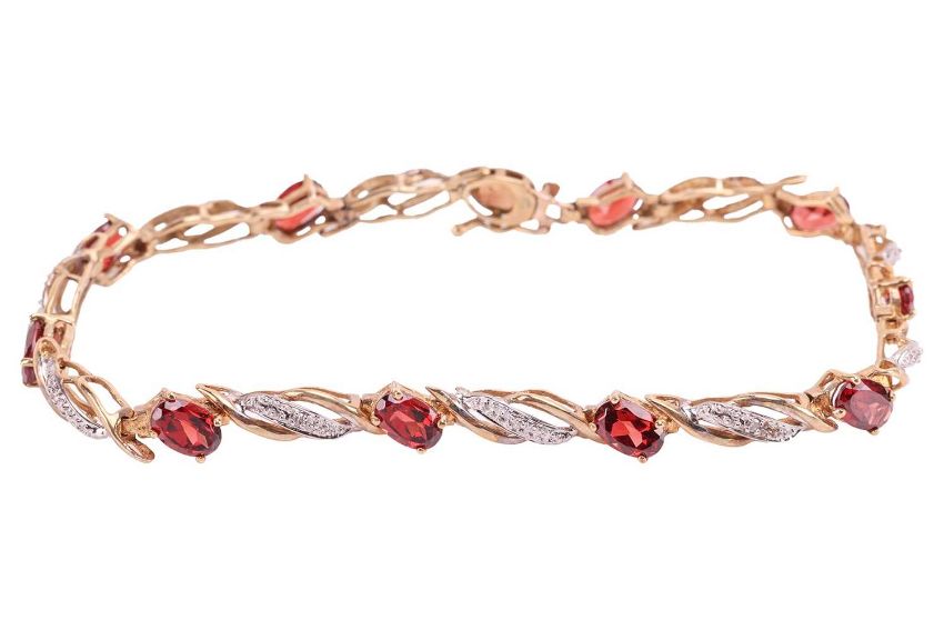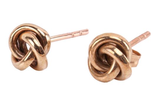 A collection of jewellery items comprising a 9ct gold garnet-set bracelet, an oval locket to a 9ct gold belcher-link chain, and a pair of yellow metal knot earrings tested as 9ct gold; 17.4 grams (3)