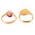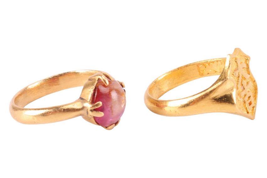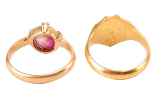 Two children's rings; to include a Chinese signet ring with a shield-shaped ring head, inscribed with the characters for auspiciousness, yellow metal with rubbed marks testing as high carat gold; together with another ring set with a star ruby 6.4 x 5.4 mm, to a D-section shank in yellow metal testing as 18ct; both in size smaller than the ring sizer, total weight of items 4.3 grams. (2)