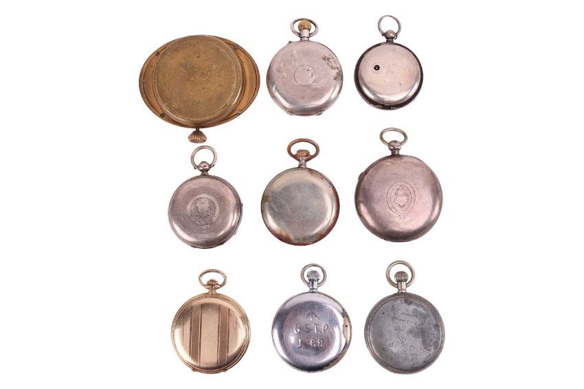 A small collection of fob watches including a Leonidas GS TP Military fob watch with radium marked black Arabic dial, the reverse bearing the legend G.S,T.P. J.68 and Broad Arrow mark, together with a Bravingtons G.S.T. military fob watch with white Arabic tropical dial, the rear bearing the legend Bravingtons London 043538, and an Omega fob watch, a S.Smith & Sons of The Strand London crown wind Chronograph fob watch and others.