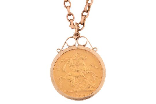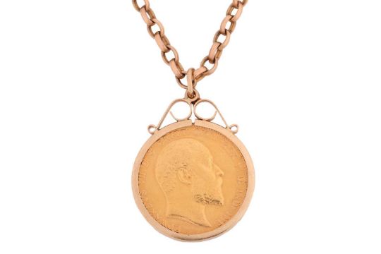 An Edwardian sovereign pendant and chain, comprising an Edward VII full sovereign, 1906, unsoldered in pendant mount, to a yellow metal belcher chain tested as 9ct gold, measuring approximately 68cm; 26.1 grams