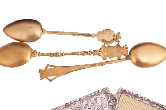 A cased set of twelve gilt and enamel decorated spoons, nine with named views to the bowls, two with unnamed view and the last with plain gilt bowl, together with a set of six gilt 800 standard coffee spoons and a German 800 standard silver gilt anointing spoon and an 835 mounted folding comb, (20).