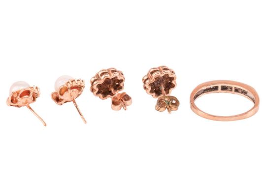 A collection of jewellery items including a 9ct gold fob and three pairs of earrings, including a pair of opal-set earrings, in yellow metal marked '375', a pair of 9ct gold pearl-set earrings, and a 9ct gold diamond-set half-eternity ring, featuring eight channel-set round brilliant diamonds, size M; 16.4 grams (4)