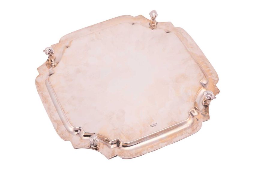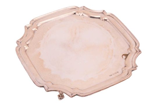 A shaped square silver salver on four scroll feet, 26.5cm x 26.5cm, Sheffield 1959, Viner's Ltd (Emile Viner), 20ozt.