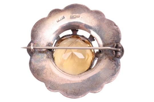 A Scottish hardstone brooch set with a large faceted citrine, to a scalloped surround adorned with polished jasper, banded agate and bloodstone, Birmingham 1912, 4.2 cm wide, 16.0 grams.