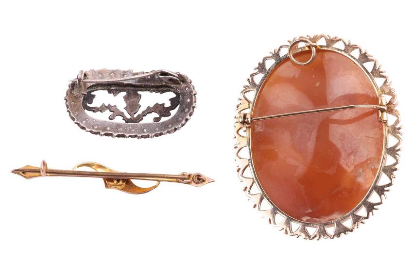 Three brooches; to include a shell cameo brooch in 9ct gold, depicting a portrait of a lady in front of a scenic background, Birmingham 1976, 5.3 cm long; a bar brooch embellished with a sapphire highlight, metal stamped '9ct', 5.2 cm wide; a thistle openwork brooch in a 'marcasite' frame, 3.4 cm wide; Total weighable 16.3 grams. (3)
