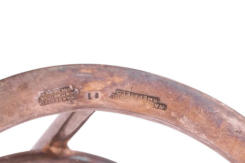 A quantity of silver including cream jugs, napkin rings, condiment pieces, a silver mounted pepper grinder, a punch ladle, 29ozt weighable, a silver plated Fortnum and Masons ham holder and an Old Sheffield plate coffee pot on a warming base.