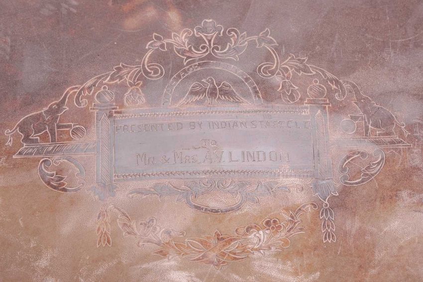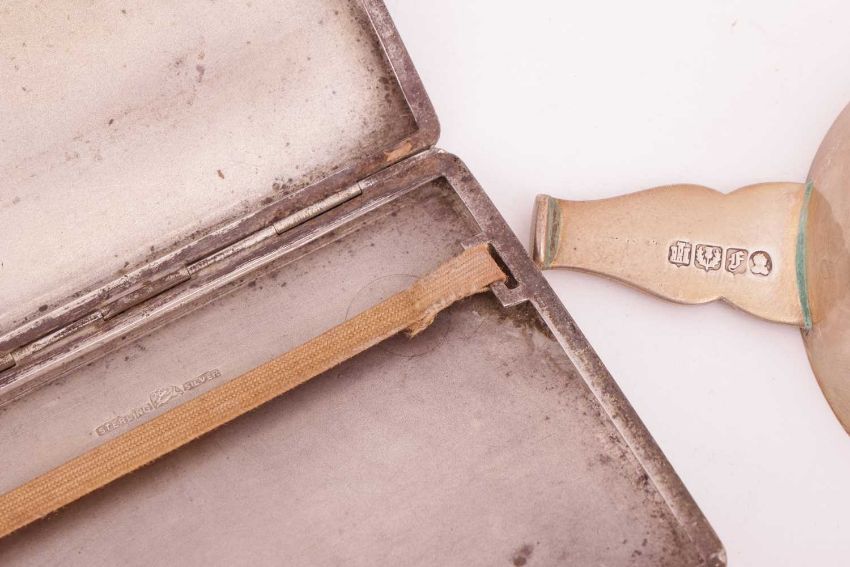 An Indian white metal two-handled presentation tray, Scottish silver quaich and spoon, and a heavy Indian "Sterling " cigarette case. 38.9 ozt gross. (4)