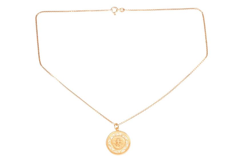 A Chinese double-sided pendant on chain, the circular pendant embellished with Chinese characters for 'prosperity' and 'longevity', framed within a meandering pierced border, marked '99' testing as high carat, 2.5 cm drop, suspending on a box link chain of 40.0 cm with Italian assay marks '585', total weight of item 7.8 grams.