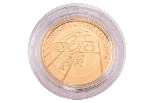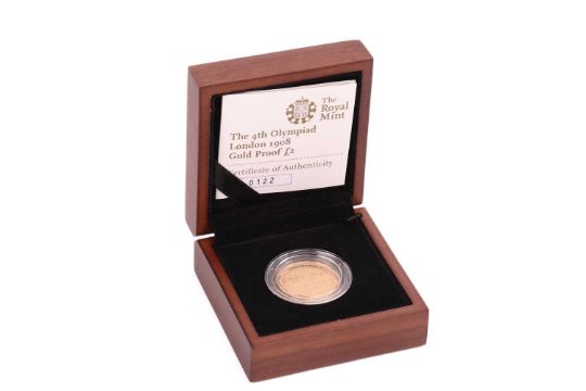 An Elizabeth II 2008 proof £2 gold coin 'The 4th Olympiad London 1908', a running track to the reverse celebrating the Centenary of the 4th Olympiad, held in London 1908, encapsulated in fitted case, number 122 from an edition of 1908, with the certificate of authenticity and outer box.