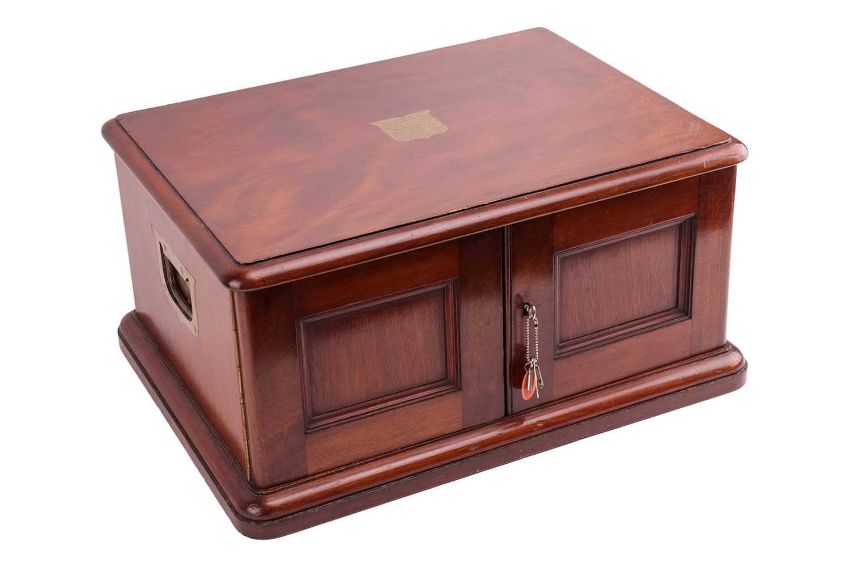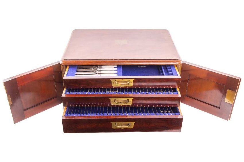 An Edwardian mahogany three-drawer canteen with inset brass handles, containing a silver plated Old English pattern service for twelve place settings and a set of twelve fruit knives and forks with mother of pearl handles, concealed behind two panelled doors with key.