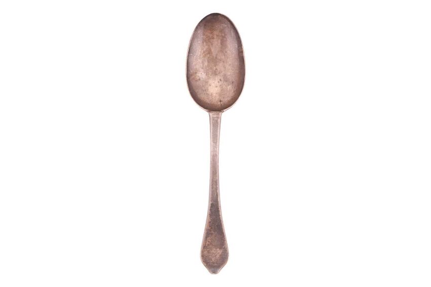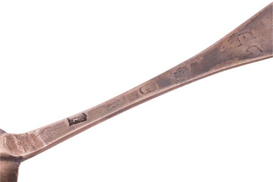 A Queen Anne silver "Dog Nose" spoon, London 1705 (?) indistinct Leopard's head erased and Britania marks, by Benjamin Watts, with pricked (marriage?) monogram; C.K. and E.G. and rat's tail drop to the bowl, 1.6 ozt, 19.1 cm long