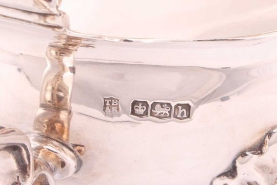A pair of silver sauce boats; with cut-away edges and double scroll handles, on three shell- mounted, stepped hoof feet. Sheffield 1924 and 1925 by Thomas Bradbury and Sons. 21.7ozt