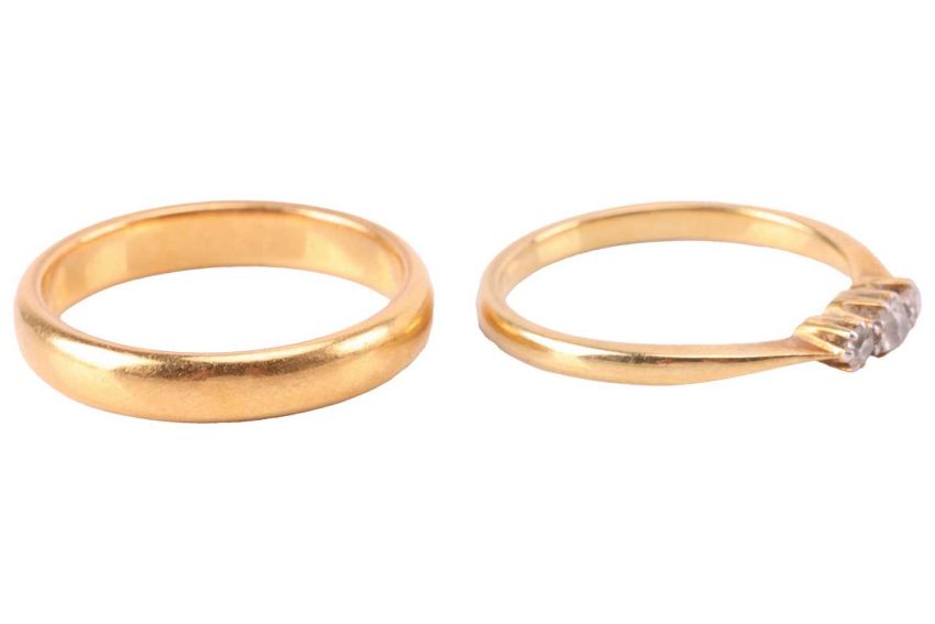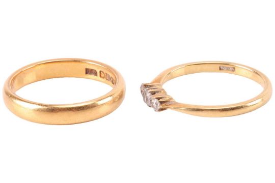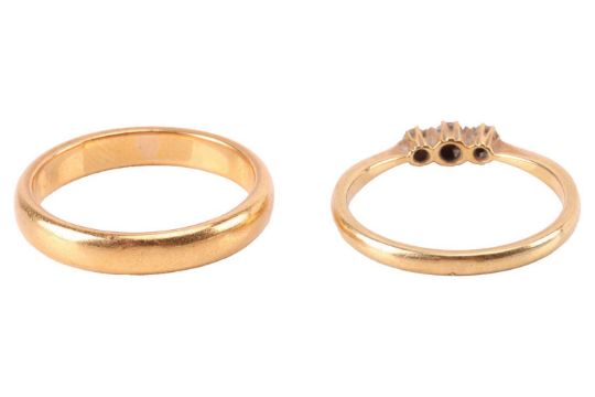 A diamond-set three-stone ring, set with old Swiss-cut diamonds, to a yellow metal shank tested as 18ct gold, size M; together with a 22ct yellow gold court-shaped wedding band, size N, hallmarked Birmingham 1850; 6.8 grams (2)